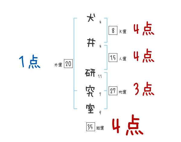 天運![]() | 犬井研究室さんの天運は8画の4つ星!勤勉家。根気強く努力し成功する。忍耐力がある。 家系が持つ宿命的な運勢を表します。祖先から受け継いだ苗字ですので自分の力が及びません。家柄を象徴します。 |