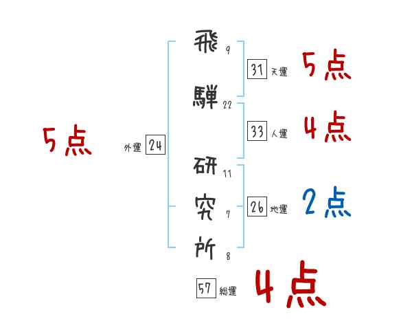 天運![]() | 飛騨研究所さんの天運は31画の5つ星!社交性があり判断力に優れる。順風満帆な人生で円満な生活。 家系が持つ宿命的な運勢を表します。祖先から受け継いだ苗字ですので自分の力が及びません。家柄を象徴します。 |