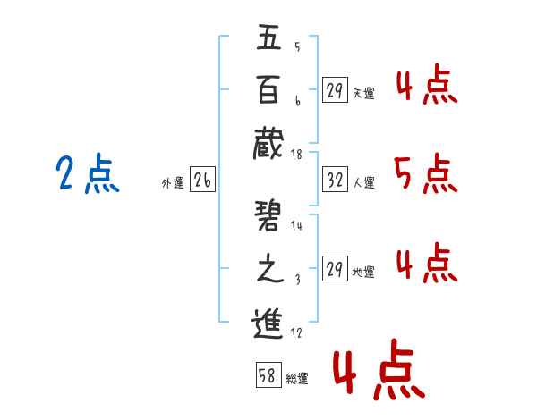 人運![]() | 五百蔵碧之進さんの人運は32画の5つ星!柔軟性があり成功する。チャンスが多く金運が良い。 性格や才能などを表す2番目に重要な運勢です。人間関係や協調性、社会的な成功に影響します。主に20歳から50歳ぐらいまでの中年期の運勢を表します。 |