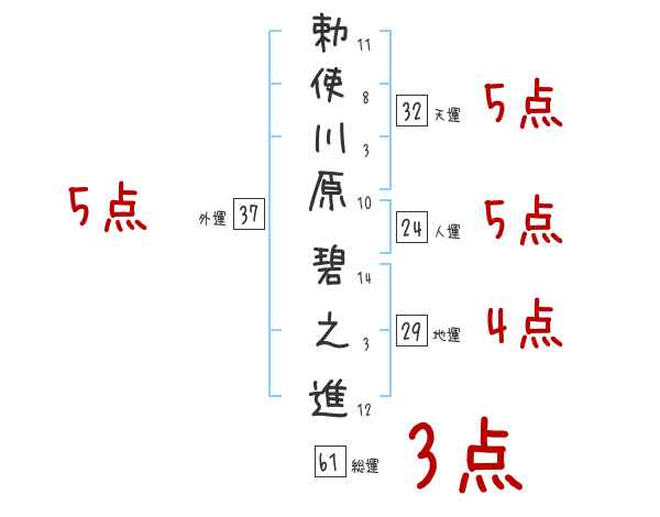 外運![]() | 勅使川原碧之進さんの外運は37画の5つ星!努力家で順応性に優れる。現実的な考え方ができ忠実に物事をこなす。 生活面を象徴する運勢です。外部から受ける影響力を表し、結婚運、家庭運や職場、環境への順応性を表します。 |