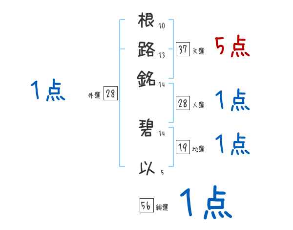 総運![]() | 根路銘碧以さんの総運は56画の1つ星!消極的で無気力になりがち。誠実な気持ちが必要でしょう。 あなたの人生を表す1番重要な運勢です。生涯を通じて影響する総合運となり、主に50歳以降の晩年期に影響を及ぼします。 |
