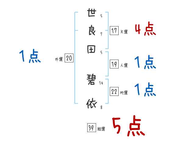 総運![]() | 世良田碧依さんの総運は39画の5つ星!社交性に優れ人望が厚い。人の上に立ち成功する。 あなたの人生を表す1番重要な運勢です。生涯を通じて影響する総合運となり、主に50歳以降の晩年期に影響を及ぼします。 |