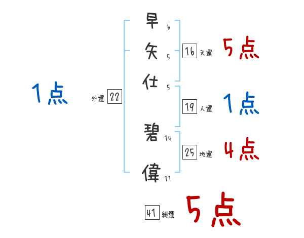 天運![]() | 早矢仕碧偉さんの天運は16画の5つ星!人望が厚く大きく発展する。逆転成功が見える。 家系が持つ宿命的な運勢を表します。祖先から受け継いだ苗字ですので自分の力が及びません。家柄を象徴します。 |