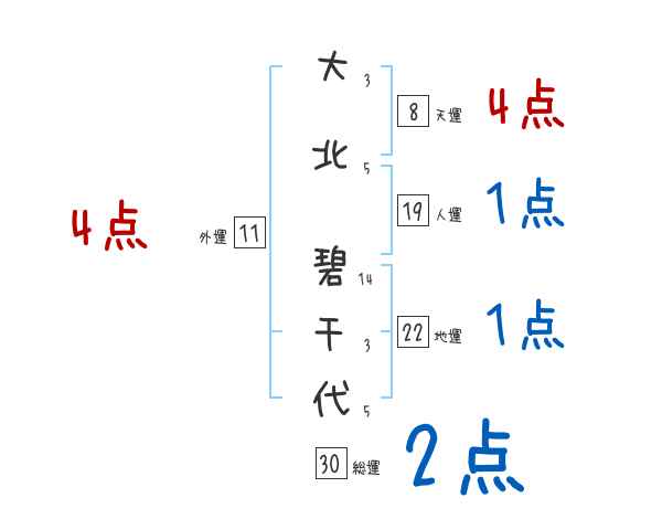天運![]() | 大北碧千代さんの天運は8画の4つ星!勤勉家。根気強く努力し成功する。忍耐力がある。 家系が持つ宿命的な運勢を表します。祖先から受け継いだ苗字ですので自分の力が及びません。家柄を象徴します。 |