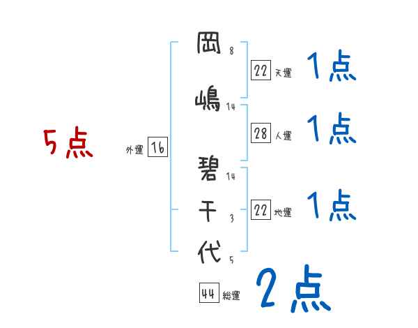 外運![]() | 岡嶋碧千代さんの外運は16画の5つ星!人望が厚く大きく発展する。逆転成功が見える。 生活面を象徴する運勢です。外部から受ける影響力を表し、結婚運、家庭運や職場、環境への順応性を表します。 |