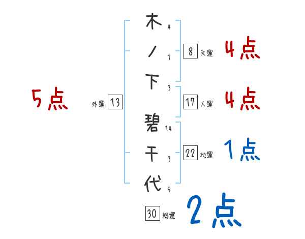 総運![]() | 木ノ下碧千代さんの総運は30画の2つ星!浮き沈みの激しさに注意しましょう。 あなたの人生を表す1番重要な運勢です。生涯を通じて影響する総合運となり、主に50歳以降の晩年期に影響を及ぼします。 |