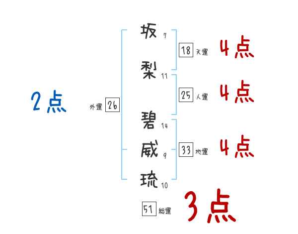 外運![]() | 坂梨碧威琉さんの外運は26画の2つ星!波瀾万丈かも。信頼できる人を大事にしましょう。 生活面を象徴する運勢です。外部から受ける影響力を表し、結婚運、家庭運や職場、環境への順応性を表します。 |