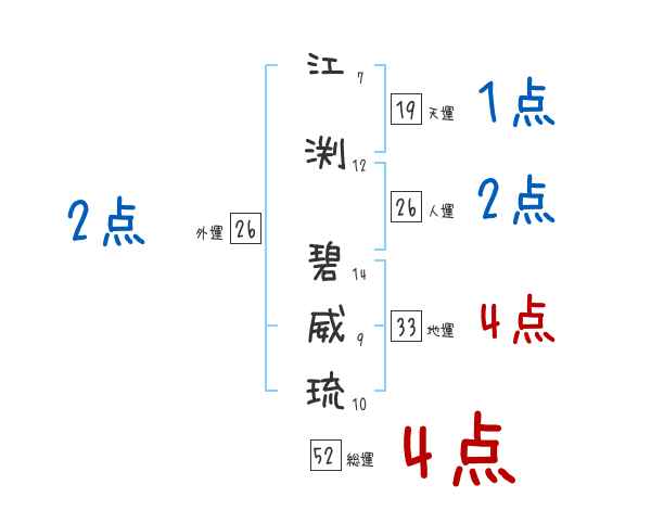 外運![]() | 江渕碧威琉さんの外運は26画の2つ星!波瀾万丈かも。信頼できる人を大事にしましょう。 生活面を象徴する運勢です。外部から受ける影響力を表し、結婚運、家庭運や職場、環境への順応性を表します。 |