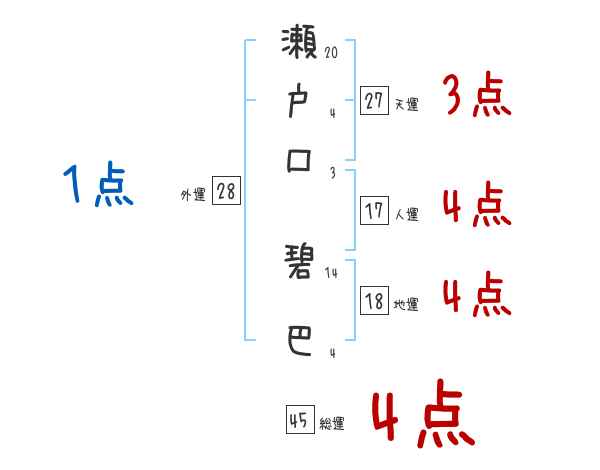 天運![]() | 瀬戸口碧巴さんの天運は27画の3つ星!頭脳明晰だが強情で摩擦が多い傾向。孤立に注意。 家系が持つ宿命的な運勢を表します。祖先から受け継いだ苗字ですので自分の力が及びません。家柄を象徴します。 |