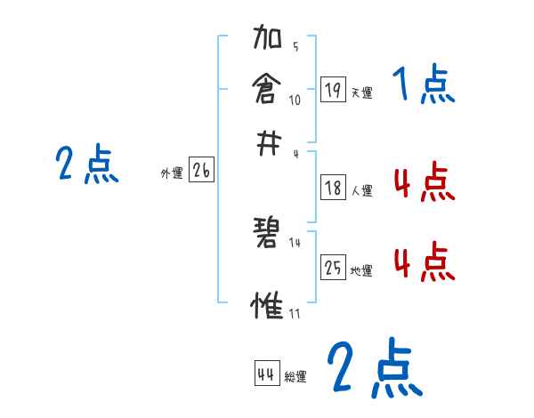 総運![]() | 加倉井碧惟さんの総運は44画の2つ星!誠実で慎重な性格。物事を考えすぎないように注意しましょう。 あなたの人生を表す1番重要な運勢です。生涯を通じて影響する総合運となり、主に50歳以降の晩年期に影響を及ぼします。 |