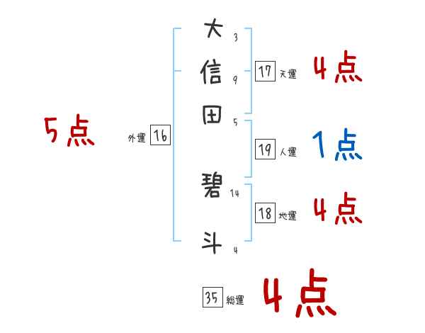 外運![]() | 大信田碧斗さんの外運は16画の5つ星!人望が厚く大きく発展する。逆転成功が見える。 生活面を象徴する運勢です。外部から受ける影響力を表し、結婚運、家庭運や職場、環境への順応性を表します。 |