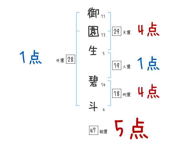 外運![]() | 御園生碧斗さんの外運は28画の1つ星!家庭環境に注意。スポーツで活躍できる能力があるかも。 生活面を象徴する運勢です。外部から受ける影響力を表し、結婚運、家庭運や職場、環境への順応性を表します。 |