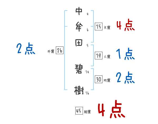 外運![]() | 中牟田碧樹さんの外運は26画の2つ星!波瀾万丈かも。信頼できる人を大事にしましょう。 生活面を象徴する運勢です。外部から受ける影響力を表し、結婚運、家庭運や職場、環境への順応性を表します。 |