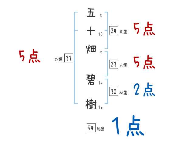 天運![]() | 五十畑碧樹さんの天運は24画の5つ星!家庭運が良く順調な人生。金運にも恵まれる。 家系が持つ宿命的な運勢を表します。祖先から受け継いだ苗字ですので自分の力が及びません。家柄を象徴します。 |