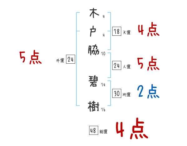人運![]() | 木戸脇碧樹さんの人運は24画の5つ星!家庭運が良く順調な人生。金運にも恵まれる。 性格や才能などを表す2番目に重要な運勢です。人間関係や協調性、社会的な成功に影響します。主に20歳から50歳ぐらいまでの中年期の運勢を表します。 |
