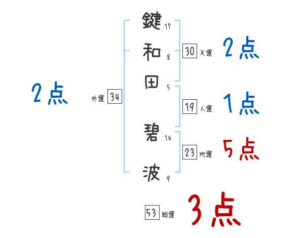 総運![]() | 鍵和田碧波さんの総運は53画の3つ星!やや見栄っ張りで虚栄心がある。散財に注意。 あなたの人生を表す1番重要な運勢です。生涯を通じて影響する総合運となり、主に50歳以降の晩年期に影響を及ぼします。 |