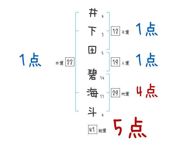 総運![]() | 井下田碧海斗さんの総運は41画の5つ星!大志を抱き、目標に向かって実力を発揮し達成する。温和な性格。 あなたの人生を表す1番重要な運勢です。生涯を通じて影響する総合運となり、主に50歳以降の晩年期に影響を及ぼします。 |
