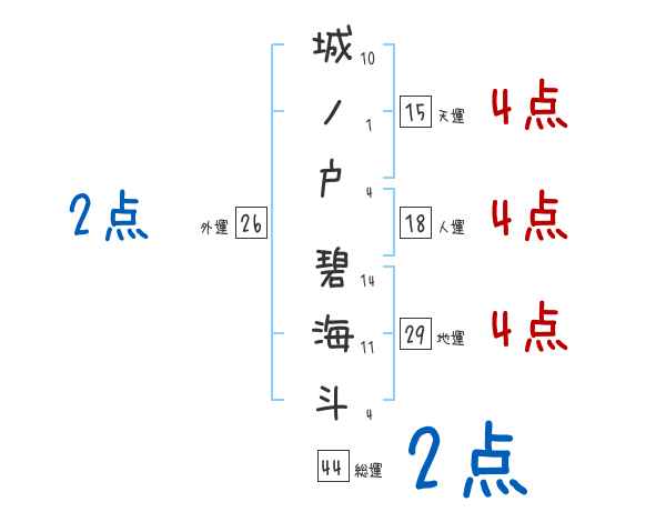 総運![]() | 城ノ戸碧海斗さんの総運は44画の2つ星!誠実で慎重な性格。物事を考えすぎないように注意しましょう。 あなたの人生を表す1番重要な運勢です。生涯を通じて影響する総合運となり、主に50歳以降の晩年期に影響を及ぼします。 |