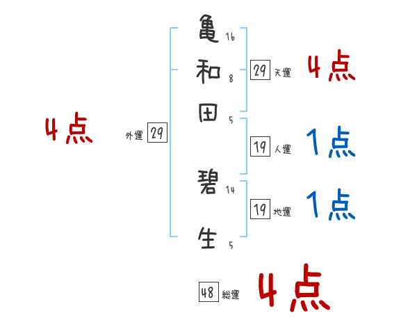 外運![]() | 亀和田碧生さんの外運は29画の4つ星!完全主義で才能がある。厳格な心の持ち主。 生活面を象徴する運勢です。外部から受ける影響力を表し、結婚運、家庭運や職場、環境への順応性を表します。 |