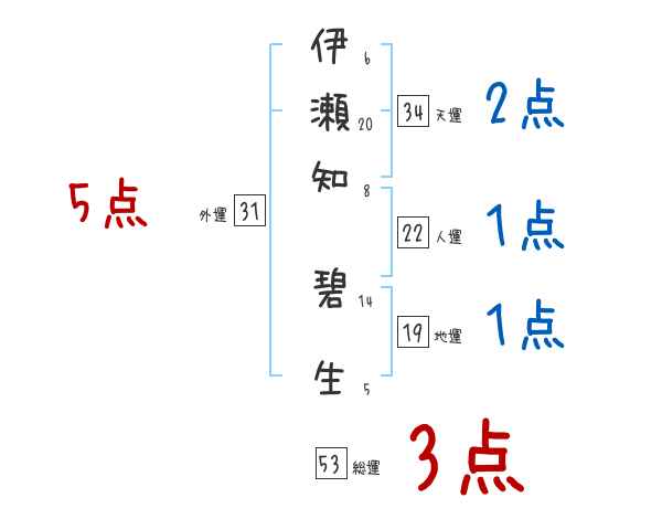 総運![]() | 伊瀬知碧生さんの総運は53画の3つ星!やや見栄っ張りで虚栄心がある。散財に注意。 あなたの人生を表す1番重要な運勢です。生涯を通じて影響する総合運となり、主に50歳以降の晩年期に影響を及ぼします。 |