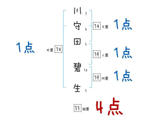 外運![]() | 川守田碧生さんの外運は14画の1つ星!人に対して優しいがストレスを溜め込みがち。人間関係のトラブルを避けるよう気をつけましょう。 生活面を象徴する運勢です。外部から受ける影響力を表し、結婚運、家庭運や職場、環境への順応性を表します。 |