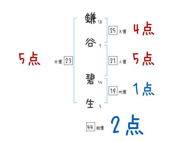 人運![]() | 鎌谷碧生さんの人運は21画の5つ星!統率力がある。独立し成功する。名誉を手に入れる。 性格や才能などを表す2番目に重要な運勢です。人間関係や協調性、社会的な成功に影響します。主に20歳から50歳ぐらいまでの中年期の運勢を表します。 |