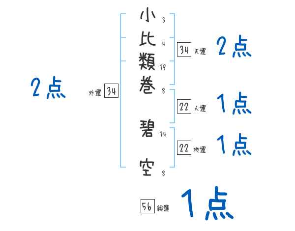 人運![]() | 小比類巻碧空さんの人運は22画の1つ星!努力することが苦手ないっぽう手先が器用。芸術性にも優れる。 性格や才能などを表す2番目に重要な運勢です。人間関係や協調性、社会的な成功に影響します。主に20歳から50歳ぐらいまでの中年期の運勢を表します。 |