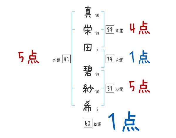天運![]() | 真栄田碧紗希さんの天運は29画の4つ星!完全主義で才能がある。厳格な心の持ち主。 家系が持つ宿命的な運勢を表します。祖先から受け継いだ苗字ですので自分の力が及びません。家柄を象徴します。 |