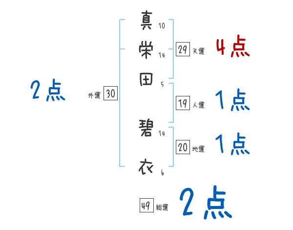 天運![]() | 真栄田碧衣さんの天運は29画の4つ星!完全主義で才能がある。厳格な心の持ち主。 家系が持つ宿命的な運勢を表します。祖先から受け継いだ苗字ですので自分の力が及びません。家柄を象徴します。 |