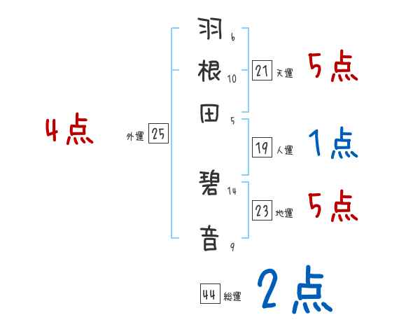 総運![]() | 羽根田碧音さんの総運は44画の2つ星!誠実で慎重な性格。物事を考えすぎないように注意しましょう。 あなたの人生を表す1番重要な運勢です。生涯を通じて影響する総合運となり、主に50歳以降の晩年期に影響を及ぼします。 |