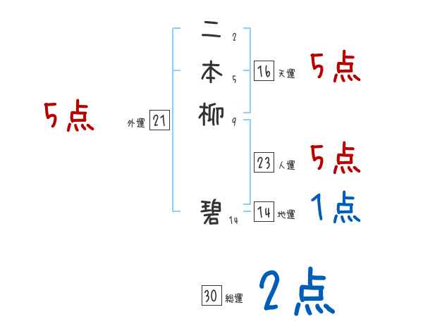 天運![]() | 二本柳碧さんの天運は16画の5つ星!人望が厚く大きく発展する。逆転成功が見える。 家系が持つ宿命的な運勢を表します。祖先から受け継いだ苗字ですので自分の力が及びません。家柄を象徴します。 |