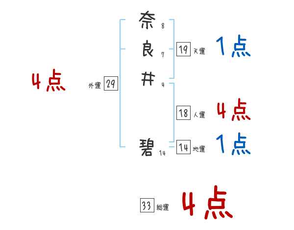 天運![]() | 奈良井碧さんの天運は19画の1つ星!優れた才能を持ちますが、協調性が足りないことも。周りの人と協力する事を意識しましょう。 家系が持つ宿命的な運勢を表します。祖先から受け継いだ苗字ですので自分の力が及びません。家柄を象徴します。 |