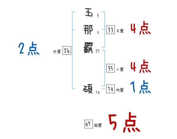 総運![]() | 玉那覇碩さんの総運は47画の5つ星!実力が開花し発展する円満な人生。財に恵まれる。 あなたの人生を表す1番重要な運勢です。生涯を通じて影響する総合運となり、主に50歳以降の晩年期に影響を及ぼします。 |