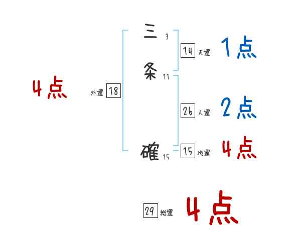 人運![]() | 三条確さんの人運は26画の2つ星!波瀾万丈かも。信頼できる人を大事にしましょう。 性格や才能などを表す2番目に重要な運勢です。人間関係や協調性、社会的な成功に影響します。主に20歳から50歳ぐらいまでの中年期の運勢を表します。 |