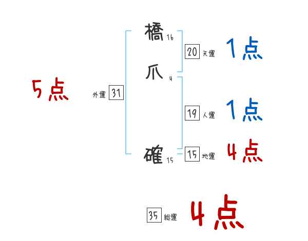 総運![]() | 橋爪確さんの総運は35画の4つ星!温厚な性格で感受性が高い。穏和な性格で人望が厚い。 あなたの人生を表す1番重要な運勢です。生涯を通じて影響する総合運となり、主に50歳以降の晩年期に影響を及ぼします。 |