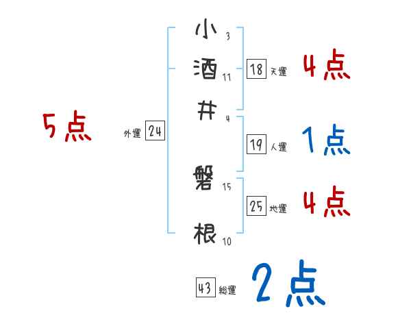 総運![]() | 小酒井磐根さんの総運は43画の2つ星!頑固な性格で独立心が強いかも。やや非現実的で浪費に注意しましょう。 あなたの人生を表す1番重要な運勢です。生涯を通じて影響する総合運となり、主に50歳以降の晩年期に影響を及ぼします。 |
