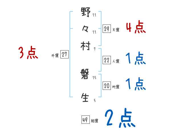 天運![]() | 野々村磐生さんの天運は29画の4つ星!完全主義で才能がある。厳格な心の持ち主。 家系が持つ宿命的な運勢を表します。祖先から受け継いだ苗字ですので自分の力が及びません。家柄を象徴します。 |