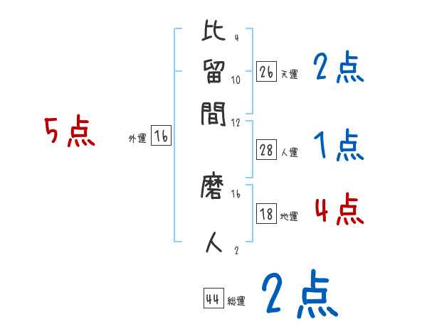 天運![]() | 比留間磨人さんの天運は26画の2つ星!波瀾万丈かも。信頼できる人を大事にしましょう。 家系が持つ宿命的な運勢を表します。祖先から受け継いだ苗字ですので自分の力が及びません。家柄を象徴します。 |