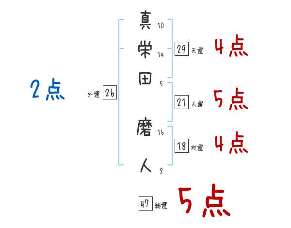 人運![]() | 真栄田磨人さんの人運は21画の5つ星!統率力がある。独立し成功する。名誉を手に入れる。 性格や才能などを表す2番目に重要な運勢です。人間関係や協調性、社会的な成功に影響します。主に20歳から50歳ぐらいまでの中年期の運勢を表します。 |
