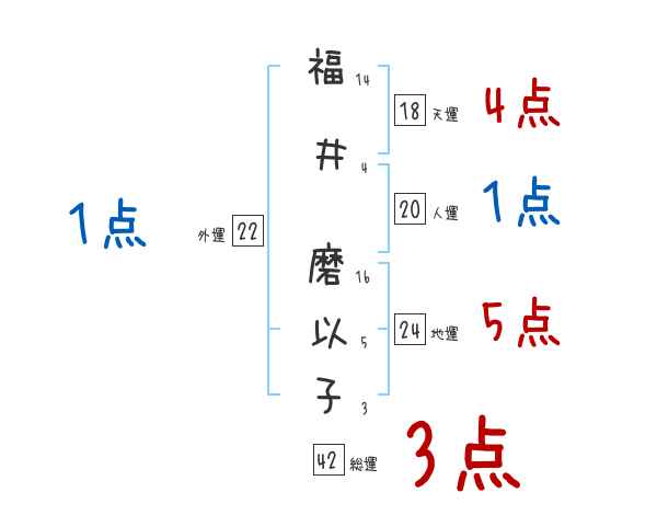 天運![]() | 福井磨以子さんの天運は18画の4つ星!情熱的で剛気。忍耐力があり信頼される。 家系が持つ宿命的な運勢を表します。祖先から受け継いだ苗字ですので自分の力が及びません。家柄を象徴します。 |