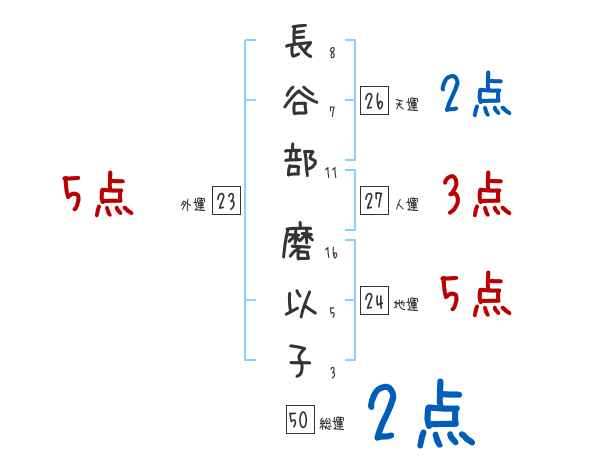 外運![]() | 長谷部磨以子さんの外運は23画の5つ星!想像力に優れ活力がある。一代で成功し名誉を手に入れる。 生活面を象徴する運勢です。外部から受ける影響力を表し、結婚運、家庭運や職場、環境への順応性を表します。 |