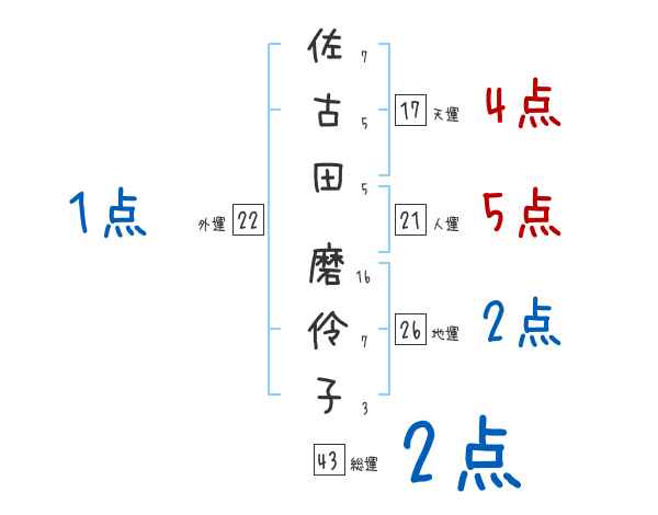 外運![]() | 佐古田磨伶子さんの外運は22画の1つ星!努力することが苦手ないっぽう手先が器用。芸術性にも優れる。 生活面を象徴する運勢です。外部から受ける影響力を表し、結婚運、家庭運や職場、環境への順応性を表します。 |