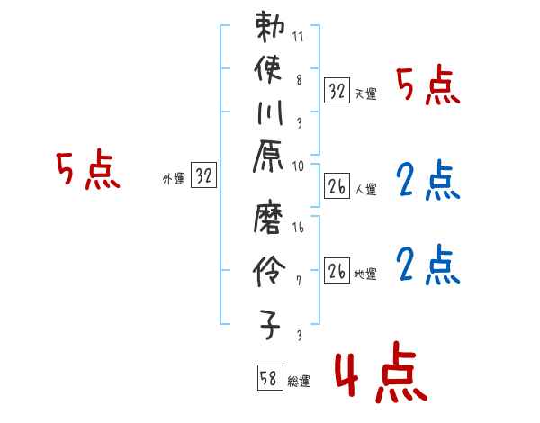 外運![]() | 勅使川原磨伶子さんの外運は32画の5つ星!柔軟性があり成功する。チャンスが多く金運が良い。 生活面を象徴する運勢です。外部から受ける影響力を表し、結婚運、家庭運や職場、環境への順応性を表します。 |
