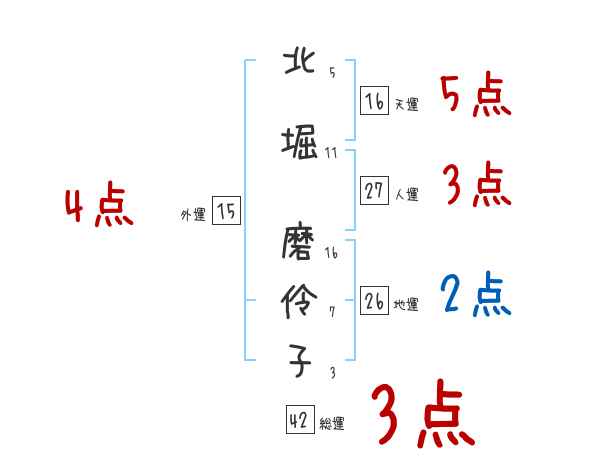 天運![]() | 北堀磨伶子さんの天運は16画の5つ星!人望が厚く大きく発展する。逆転成功が見える。 家系が持つ宿命的な運勢を表します。祖先から受け継いだ苗字ですので自分の力が及びません。家柄を象徴します。 |