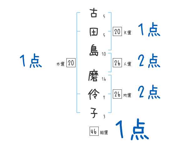総運![]() | 古田島磨伶子さんの総運は46画の1つ星!迷走することが多く苦労するかも。目先のことにとらわれないように。 あなたの人生を表す1番重要な運勢です。生涯を通じて影響する総合運となり、主に50歳以降の晩年期に影響を及ぼします。 |