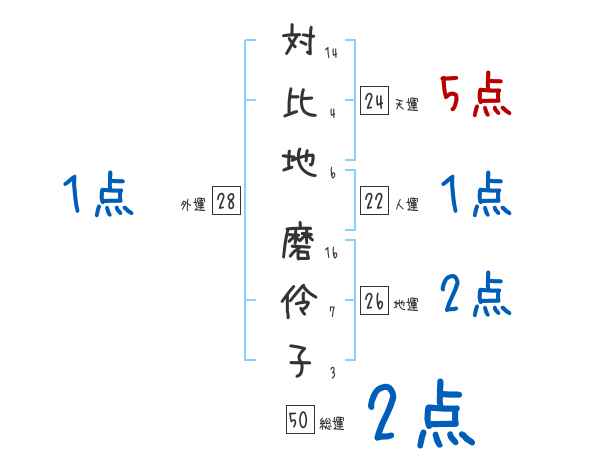 地運![]() | 対比地磨伶子さんの地運は26画の2つ星!波瀾万丈かも。信頼できる人を大事にしましょう。 個性を表す基礎的な運勢です。性格形成や対人関係、行動力など家庭環境に影響されます。主に誕生してから20歳くらいまでの若年期の運勢を表します。 |
