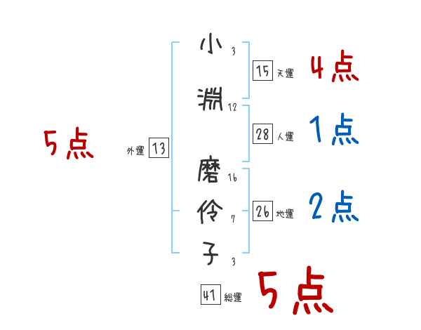 外運![]() | 小淵磨伶子さんの外運は13画の5つ星!才能に恵まれ人気がある。名声を手に入れる。円満な人生。 生活面を象徴する運勢です。外部から受ける影響力を表し、結婚運、家庭運や職場、環境への順応性を表します。 |