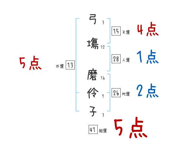 外運![]() | 弓塲磨伶子さんの外運は13画の5つ星!才能に恵まれ人気がある。名声を手に入れる。円満な人生。 生活面を象徴する運勢です。外部から受ける影響力を表し、結婚運、家庭運や職場、環境への順応性を表します。 |