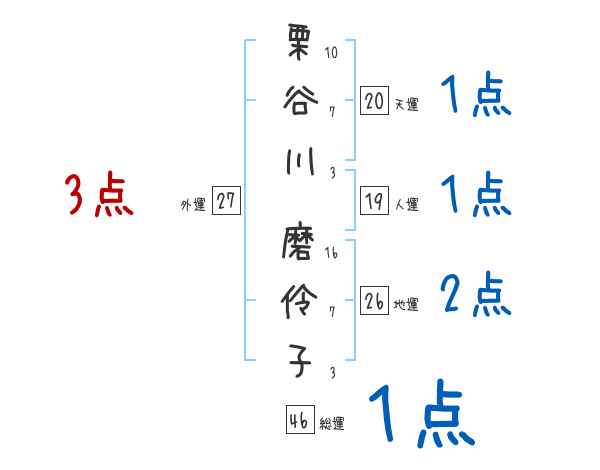 総運![]() | 栗谷川磨伶子さんの総運は46画の1つ星!迷走することが多く苦労するかも。目先のことにとらわれないように。 あなたの人生を表す1番重要な運勢です。生涯を通じて影響する総合運となり、主に50歳以降の晩年期に影響を及ぼします。 |