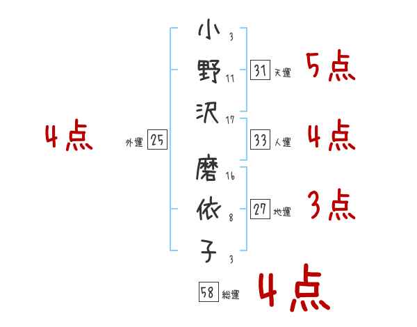 外運![]() | 小野沢磨依子さんの外運は25画の4つ星!個性があり才能があふれる。強運の持ち主で発展する。 生活面を象徴する運勢です。外部から受ける影響力を表し、結婚運、家庭運や職場、環境への順応性を表します。 |